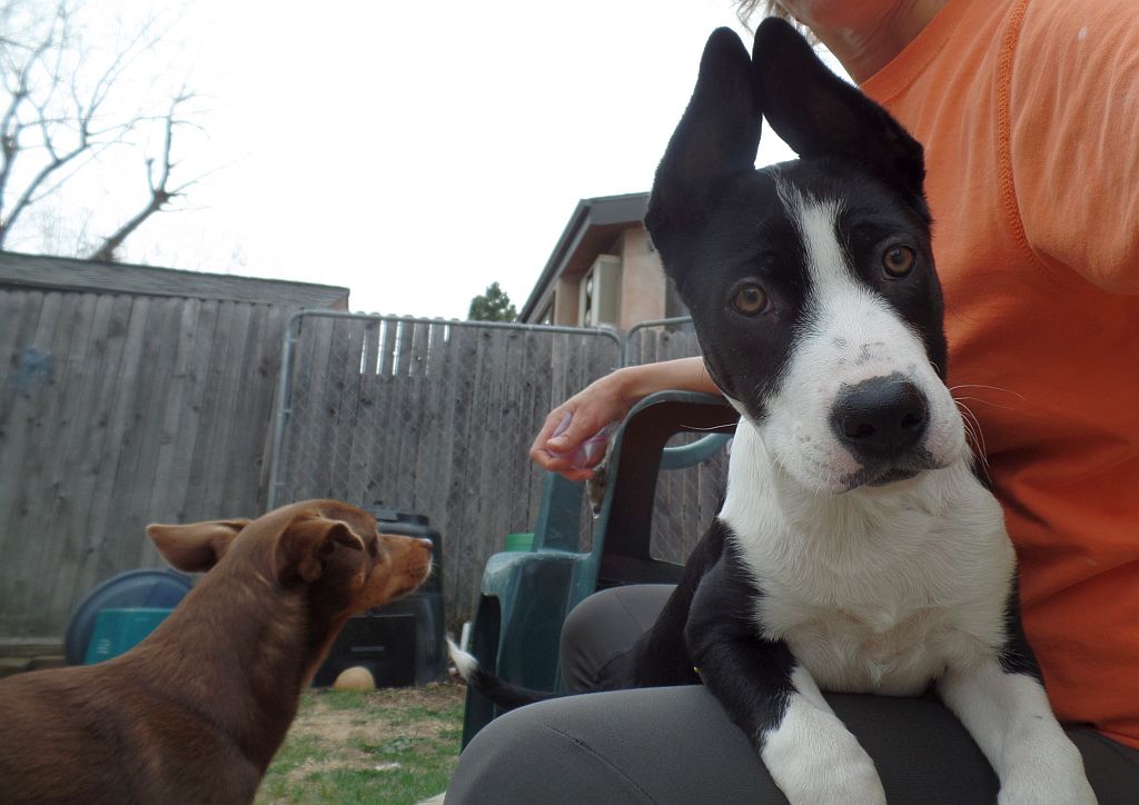 Funny thing is she was totally fine with me and Jonny and Ruby when we went to the foster mom's house, very confident, played with us. But she's only been with me 2 1/2 weeks and she was in the foster home for 5 weeks or so. I hate to push too much on her at once but that socialization window is shutting and it will only get harder.